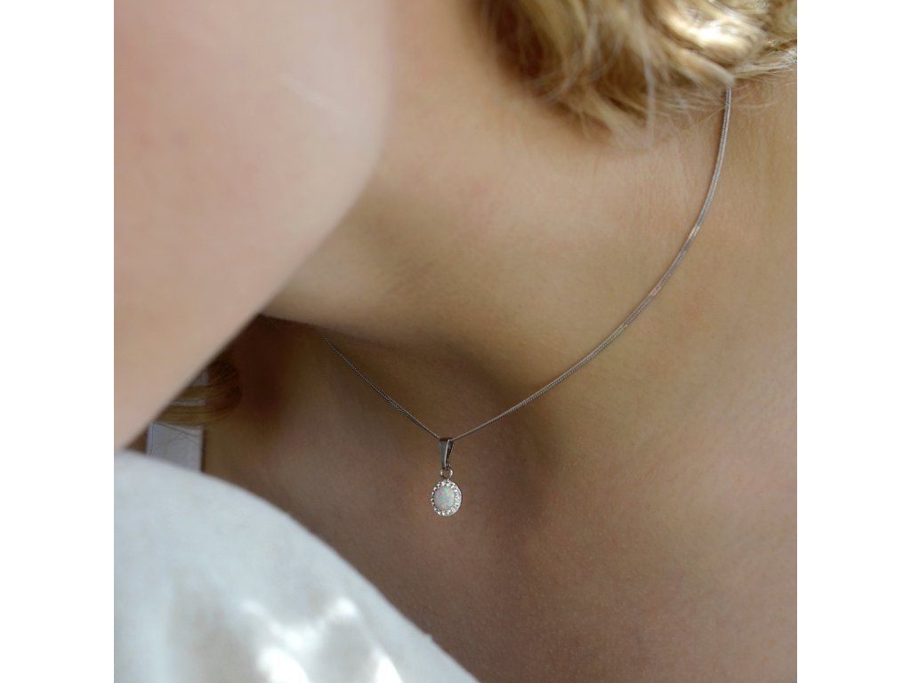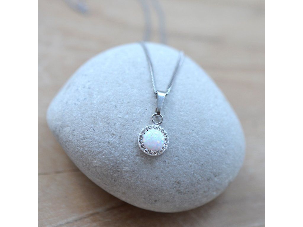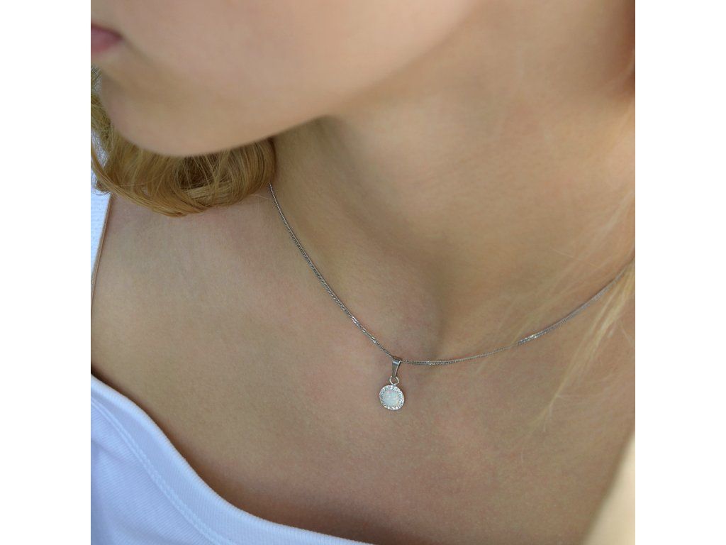 Náhrdelník obsahuje řetízek s kulatým přívěskem. Šperk je vyrobený ze stříbra ryzosti 925/1000, které prošlo povrchovou úpravou rhodiem. Rhodium chrání šperk proti zčernání, zežloutnutí i poškrábání. Přívěšek je zdobený bílým syntetickým opálem, který je navíc olemován malými třpytivými Preciosa krystaly v bílé barvě. Můžete si k němu vybrat i stejné náušnice se zapínáním na puzetu nebo šroubek. Jelikož šperk neobsahuje žádný přídavek niklu, mohou ho bez obav nosit i alergici.