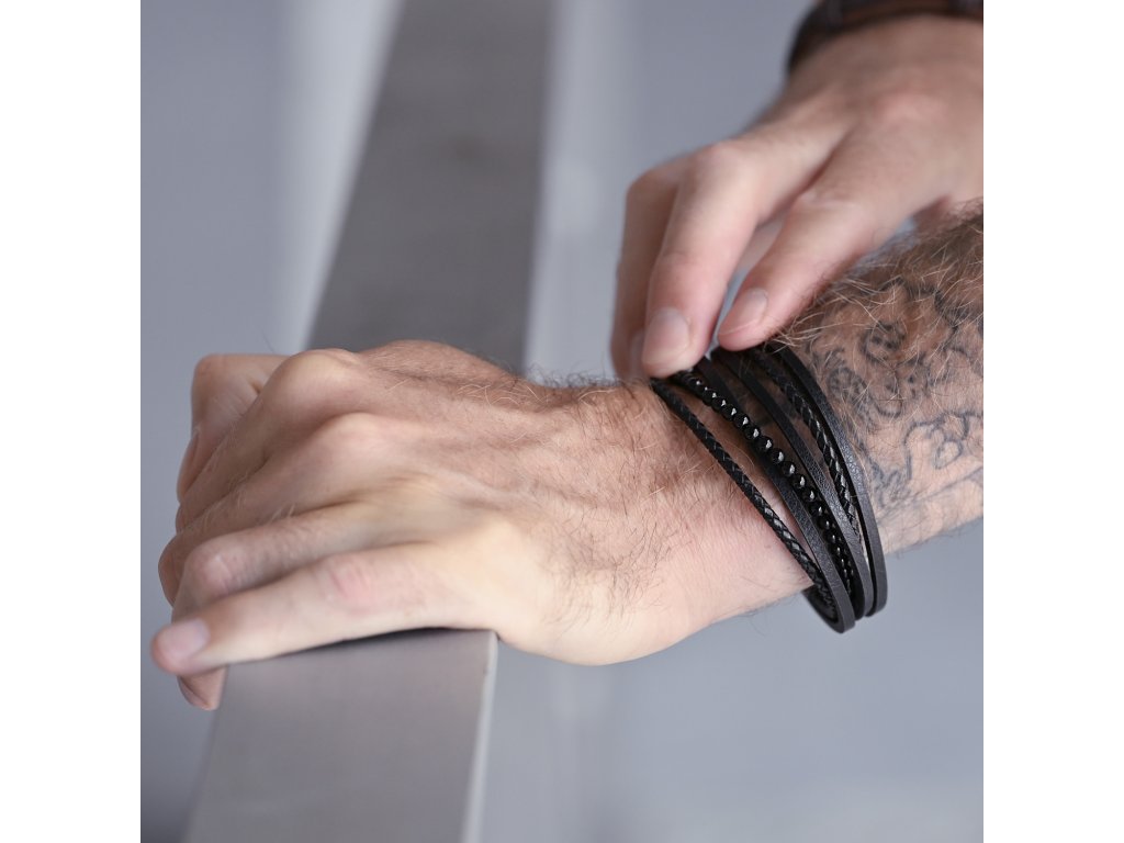 Populárním módním doplněkem pro muže je náramek složený z více pásků různého tvaru a materiálu. Vkusně tak doplní Váš outfit a přitáhne zaslouženou pozornost.Pánský náramek je vyrobený ze šesti různě tvarovaných pásků z černé recyklované kůže a černých korálků.
