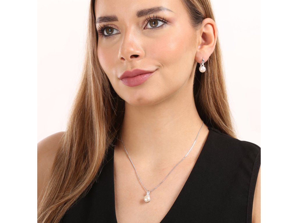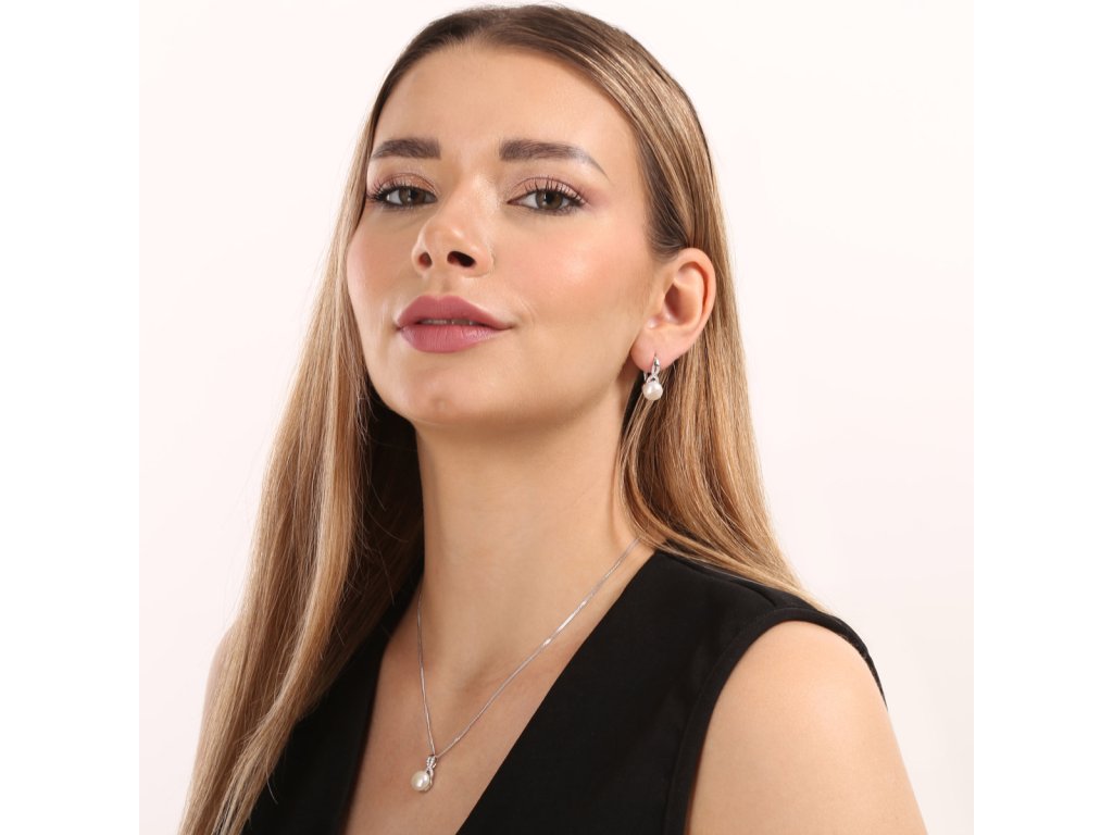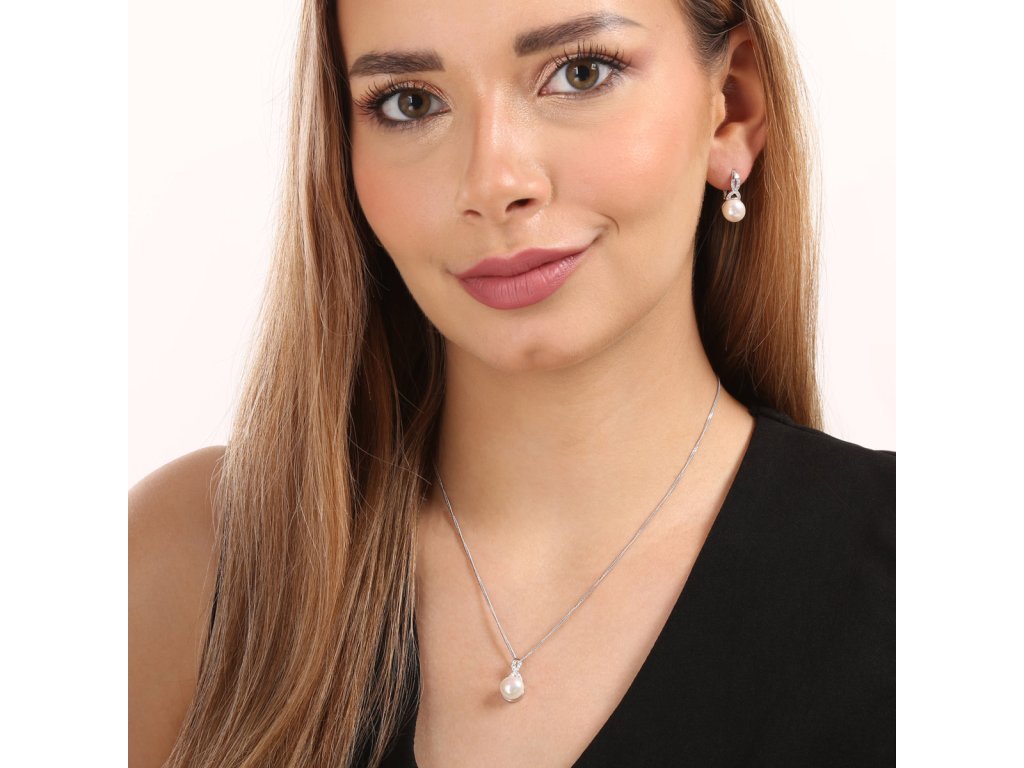 Zajímavě zpracovaná souprava náušnice a přívěsek na řetízku s bílou říční perlou a třpytivými zirkony ve tvaru nekonečna nebo chcete-li mašličky.Souprava 29082.1 je vyrobena ze stříbra o ryzosti 925/1000 s povrchovou úpravou rhodiem a zaujme říční perlou o průměru 9 mm, kvality AAA v bílé barvě. Tvar nekonečna je zdobený průzračnými zirkony, které soupravu krásně rozzáří. Náušnice mají zapínání na klapku, která je ochrání proti nechtěné ztrátě. Součástí soupravy je i stříbrný řetízek. Šperk neobsahuje přídavek niklu, a tak ho mohou nosit i lidé náchylní k alergické reakci.