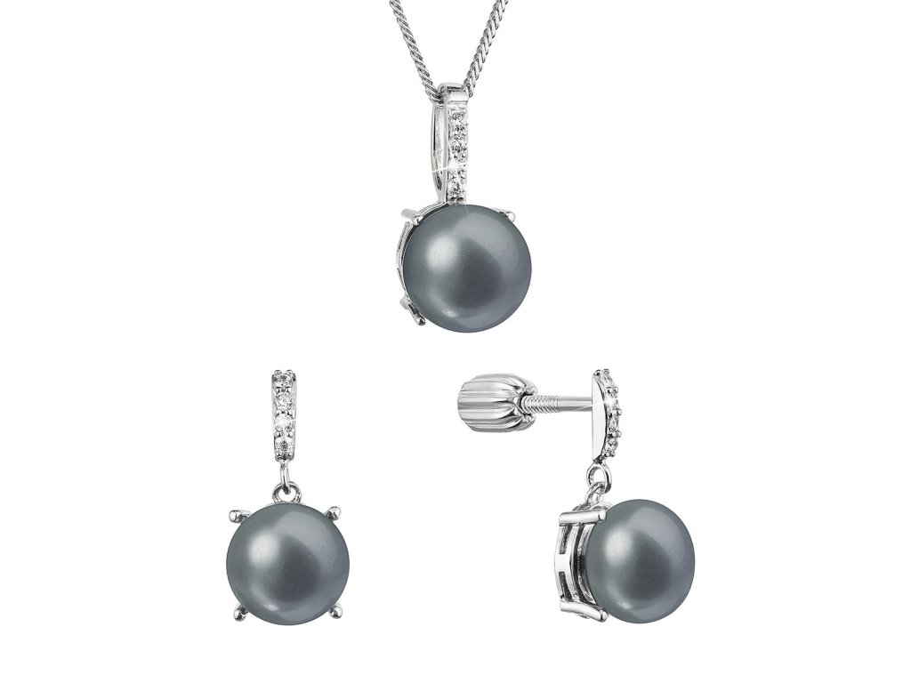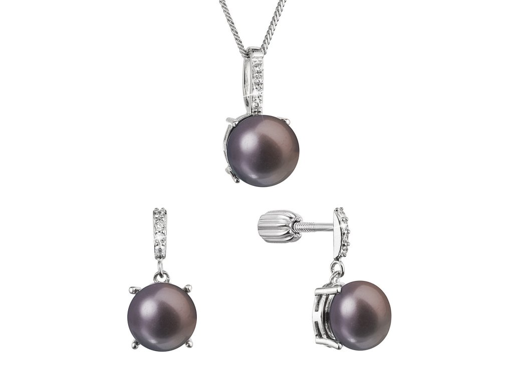 Souprava z peacock říčních perel obsahuje náušnice a přívěsek na stříbrném řetízku. Peacock sladkovodní perly, kterými jsou šperky zdobeny, mají velmi vysoký lesk, jelikož spadají do kategorie kvality AAA. Barva perel peacock je měnící se z tmavě modrého až fialového odstínu do zeleného až zlatého. Je těžké tuto barvu perliček přesně definovat, proto je nazvána podle páva, vždy jiná, podle úhlu pohledu a dopadu světla. Nad každou perlou je navíc stříbro osázeno třpytivými zirkony, které upoutají pozornost.