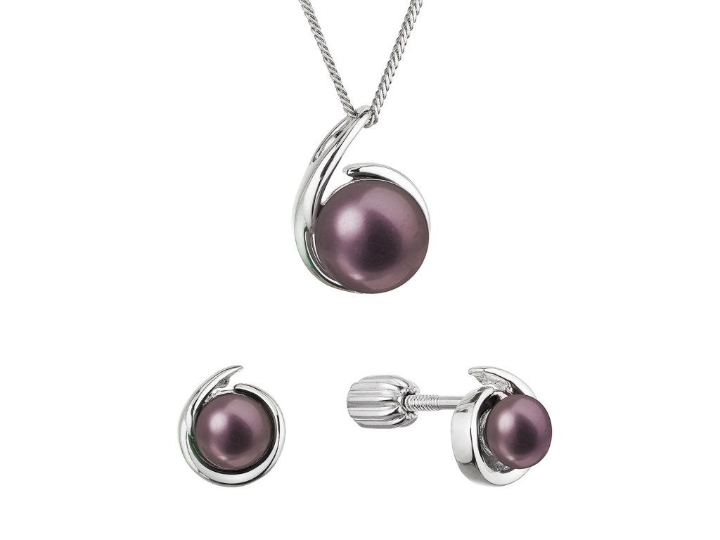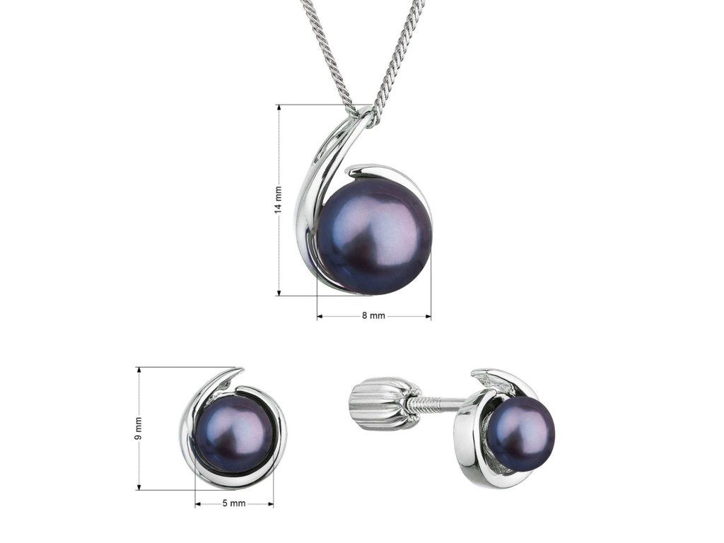 Souprava z tmavých říčních perel obsahuje slušivé náušnice a přívěšek na stříbrném řetízku. Peacock sladkovodní perly, kterými jsou šperky zdobeny, mají velmi vysoký lesk, jelikož spadají do kategorie kvality AAA. Barva perel peacock je měnící se z tmavě modrého až fialového odstínu do zeleného až zlatého. Je těžké tuto barvu perliček přesně definovat, proto je nazvána podle páva, vždy jiná, podle úhlu pohledu a dopadu světla.