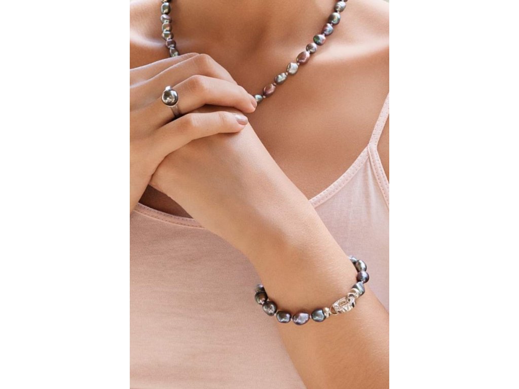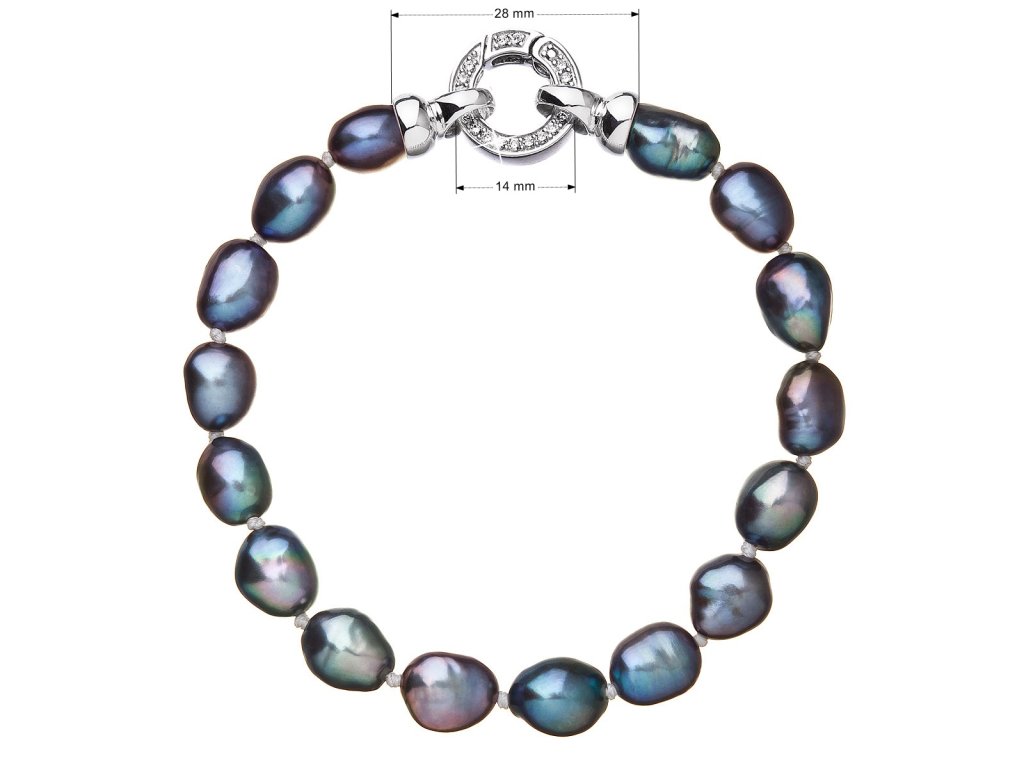 Elegantní náramek z tmavých říčních perel dokonale zvýrazní váš slavnostní outfit.Perlový náramek 23011.3 o délce 19,5 cm je složen z celkem 16 říčních perel nepravidelného tvaru o velikosti 8 - 8,5 mm. Perly spadají do kategorie kvality A mají tmavěmodrou barvu. Každá perla na náramku je zajištěna uzlíkovou vazbou, a tak se při nechtěném přetržení náramku nestane, že se vám perly rozkutálí na všechny strany. Zajímavě řešené kulaté stříbrné zapínání zdobené několika třpytivými zirkony dodává náramku na eleganci. Stříbro použité na zapínání má ryzost 925/1000 a rhodiovou povrchovou úpravu. Náramek neobsahuje nikl, a tak ho mohou bez obav nosit i alergici.