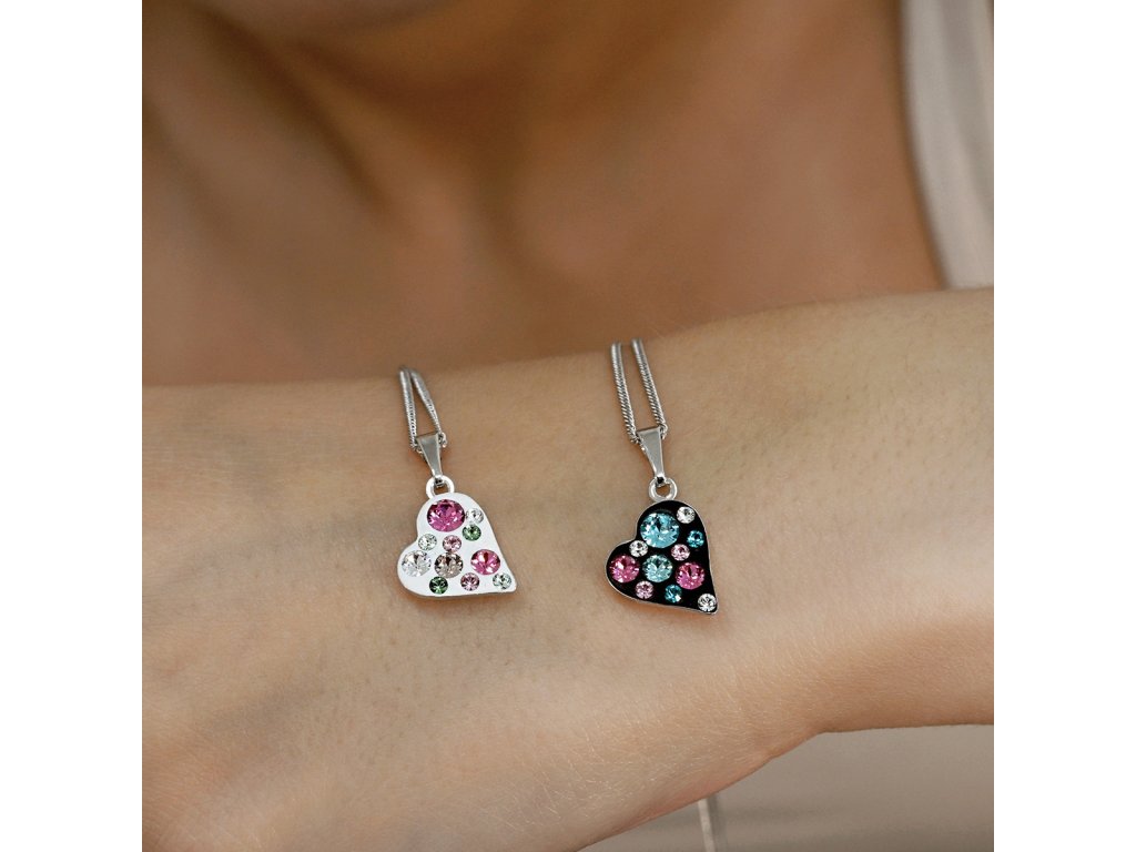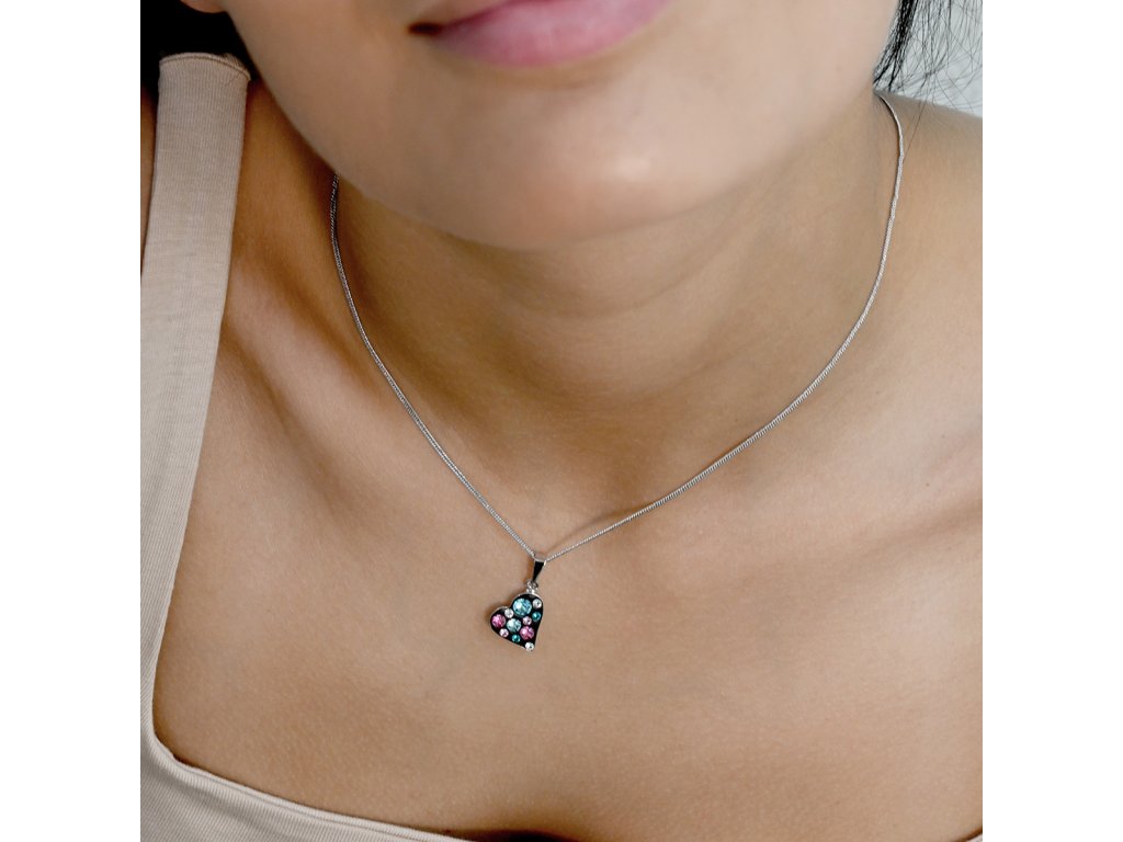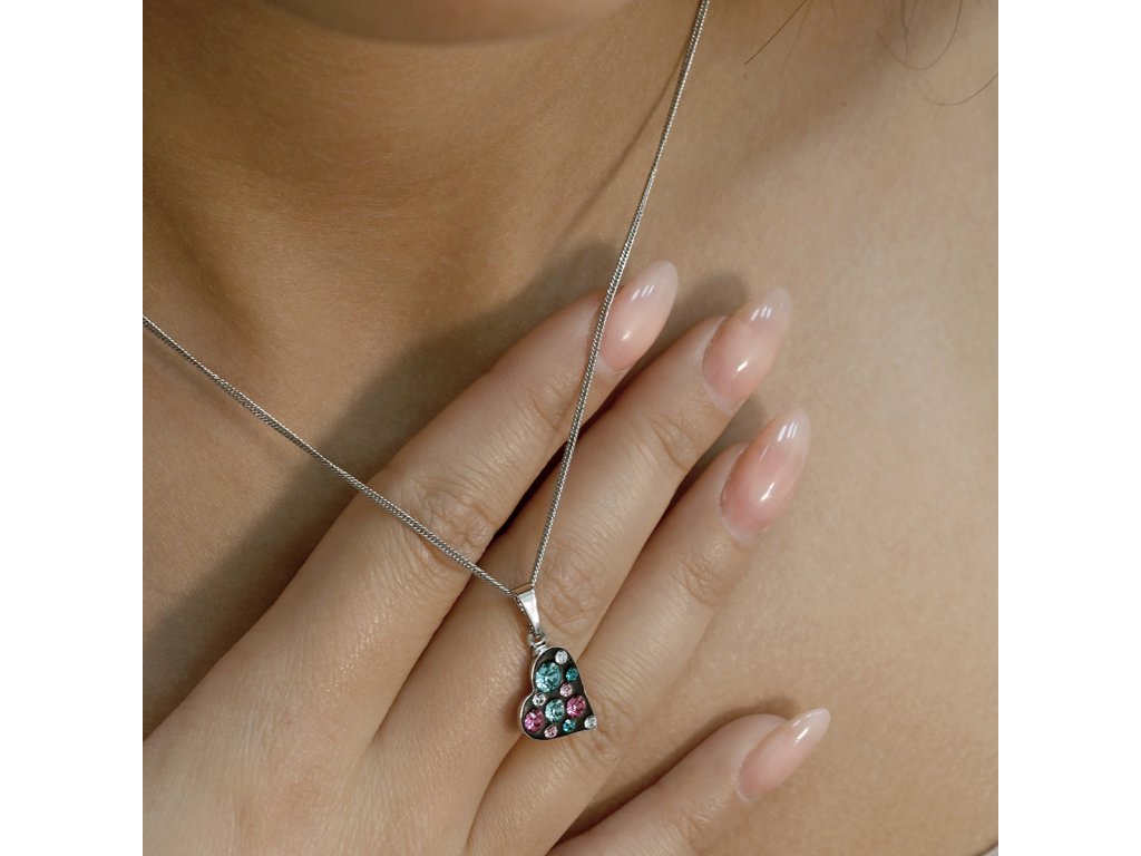 Přívěsek v ladném tvaru srdíčka je něžnou pozorností nebo poděkováním. Srdíčko je osazeno Swarovski krystaly v modrých a růžových odstínech na tmavém pozadí.Přívěšek bižuterní 54027.3 neobsahuje žádný nikl, a tak jej mohou bez obav nosit i alergici.