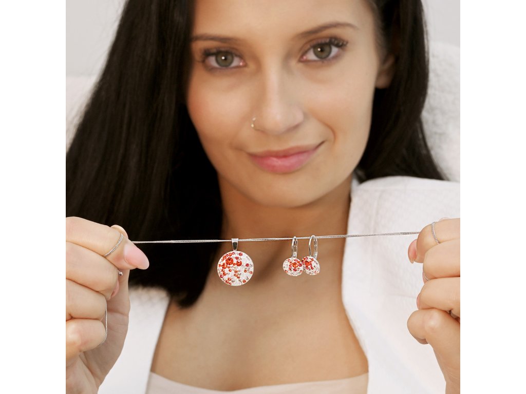 Milujete extravaganci? Jste ráda středem pozornosti? Výrazné kulaté náušnice s přívěskem vám zaručí mnoho zvídavých pohledů.Stříbrné kulaté visací náušnice a přívěsek září mnoha krystaly Swarovski. Červená barva krystalů koresponduje s rhodiovaným stříbrem 925/1000, ze kterého jsou šperky vytvořeny. Rhodium udrží šperk ve skvělé formě - bez zažloutnutí i zčernání. Zároveň chrání soupravu proti poškrábání. Šperky neobsahují nikl, je tedy vhodným dárkem i pro alergiky.