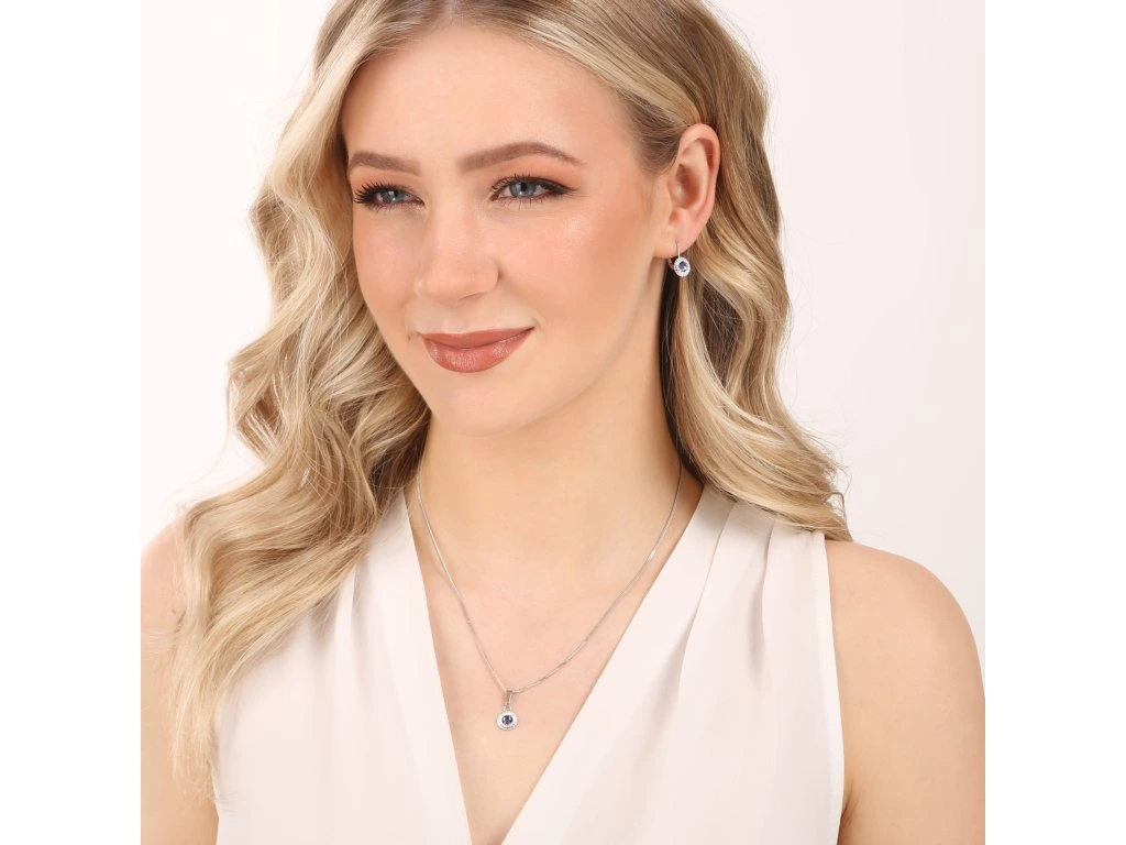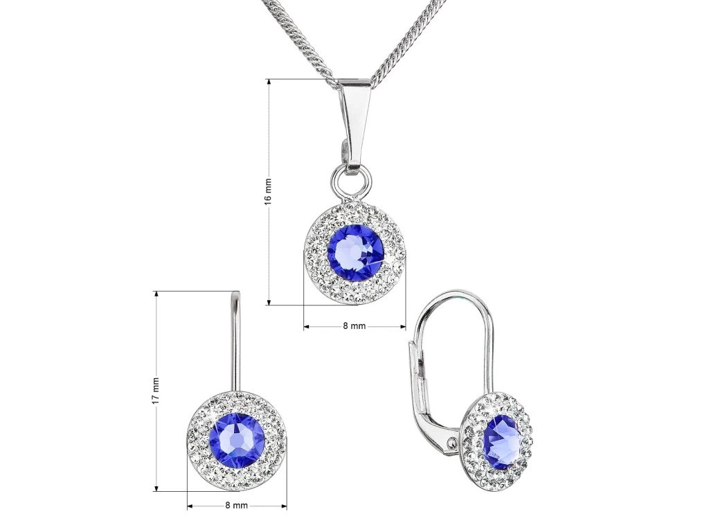 Přívěsek i náušnice jsou zdobeny Swarovski krystalem modré barvy, který je olemován ještě malými třpytivými Swarovski krystalky v bílé barvě. Náušnice mají zapínání na klapku. Jelikož šperky neobsahuji žádný přídavek niklu, mohou je bez obav nosit i alergici. Šperky jsou vyrobeny ze stříbra ryzosti 925/1000, které prošlo povrchovou úpravou rhodiem. Rhodium chrání šperk proti zčernání, zežloutnutí i poškrábání.