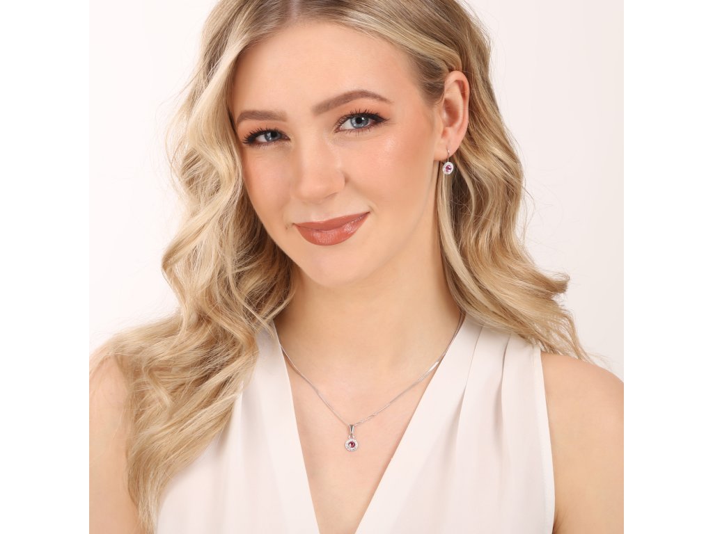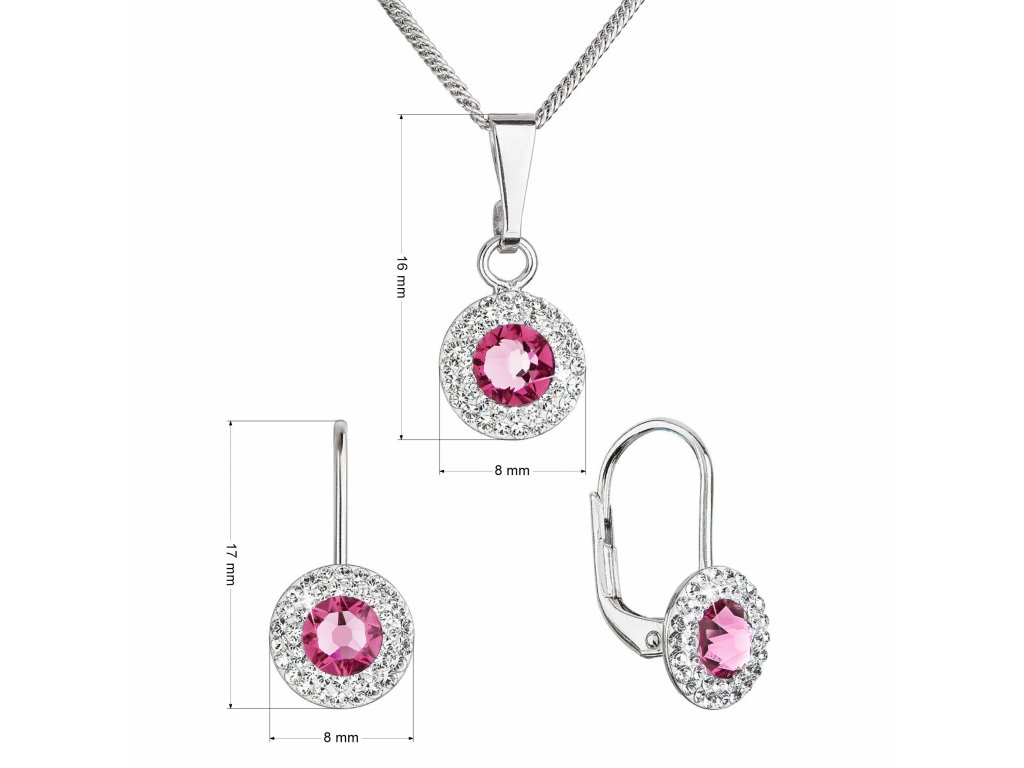 Přívěsek i náušnice jsou zdobeny Swarovski krystalem růžové barvy, který je olemován ještě malými třpytivými Swarovski krystalky v bílé barvě. Náušnice mají zapínání na klapku. Jelikož šperky neobsahuji žádný přídavek niklu, mohou je bez obav nosit i alergici. Šperky jsou vyrobeny ze stříbra ryzosti 925/1000, které prošlo povrchovou úpravou rhodiem. Rhodium chrání šperk proti zčernání, zežloutnutí i poškrábání.