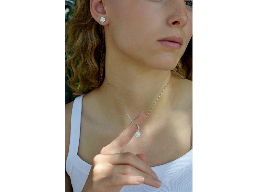 Sada 39160.1 obsahuje visací náušnice a řetízek s přívěskem. Šperky jsou vyrobeny ze stříbra ryzosti 925/1000, které prošlo povrchovou úpravou rhodiem. Rhodium chrání šperk proti zčernání, zežloutnutí i poškrábání. Přívěšek i náušnice jsou zdobeny bílým syntetickým opálem, který je navíc olemován malými třpytivými Preciosa krystaly v bílé barvě. Náušnice mají zapínání na klapku. Jelikož šperky neobsahuji žádný přídavek niklu, mohou je bez obav nosit i alergici.