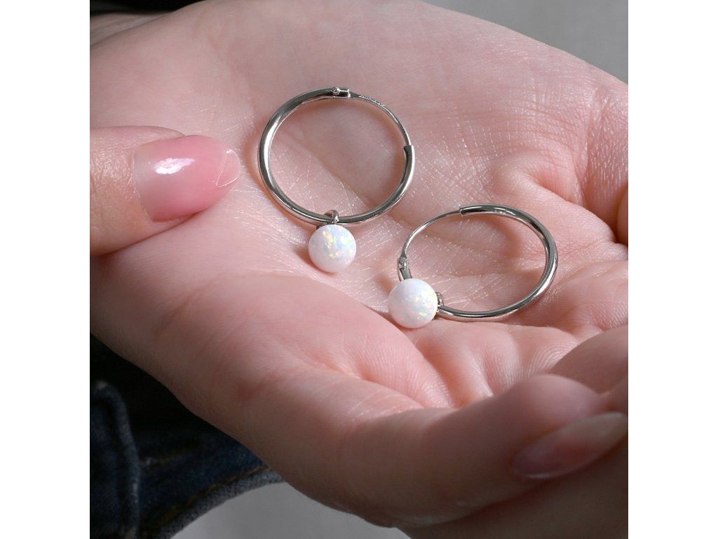 Stříbrné náušnice kruhy s kuličkou z bílého syntetického opálu 11410.1 white