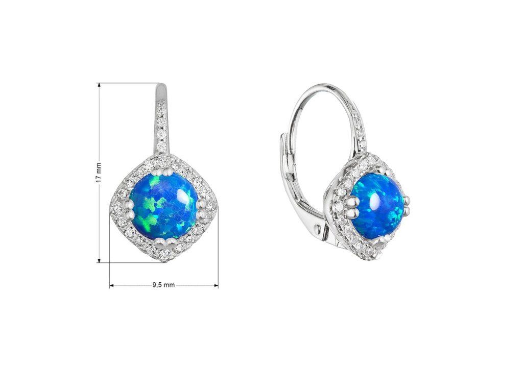Stříbrné náušnice s modrým kulatým syntetickým opálem bohatě zdobené bílými zirkony zpříjemné každou oslavu i obyčejný den.Visací náušnice vyrábíme ze stříbra ryzosti 925/1000, které je upraveno rhodiem. Díky rhodiu je šperk odolný proti zčernání, zežloutnutí nebo poškrábání. Náušnice tvoří jeden kulatý syntetický opál v modré barvě a kolem opálu jsou do tvaru kosočtverce usazeny bílé zirkony.