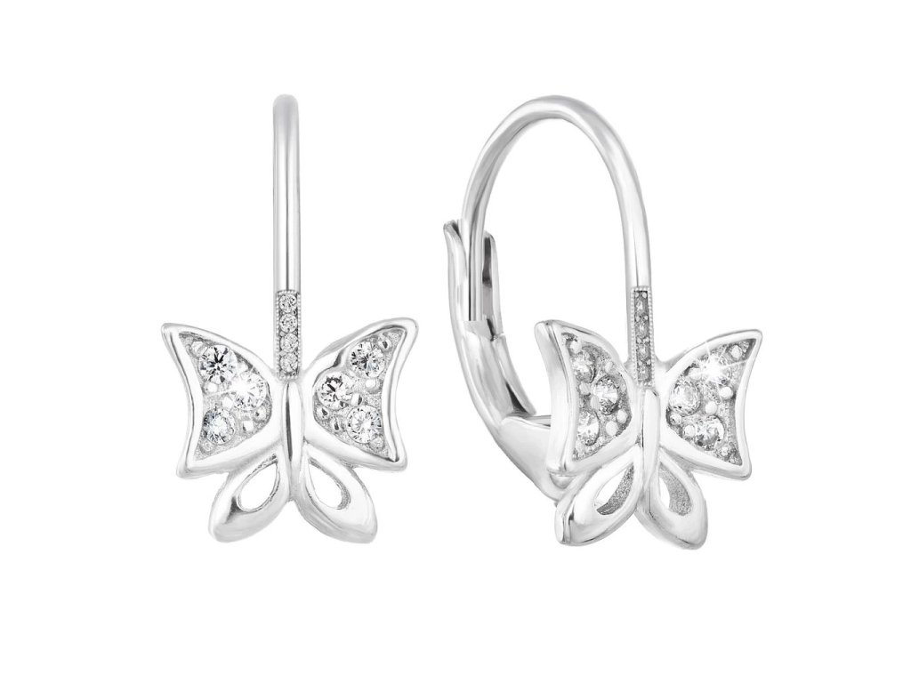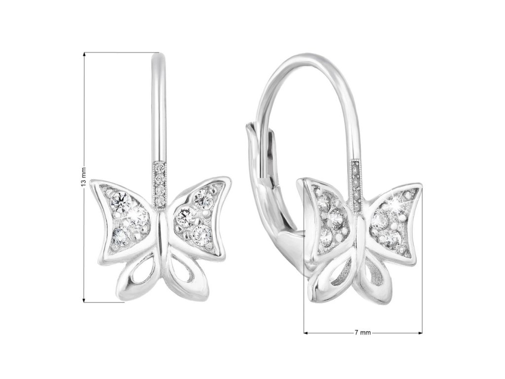 Motýlek je zdoben bílými zirkony, které dodají náušnicím třpyt a lesk. Zapínání náušnic tvoří klapka, která umožní rychlé, jednoduché navlečení a zapnutí náušnic.