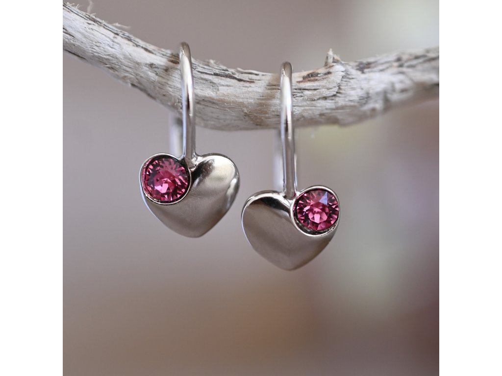 Visací náušnice ve tvaru srdce zdobí růžový krystal Swarovski, který dodává náušnicím třpytivý a elegantní vzhled. Zapínání na klapku je velice praktické.