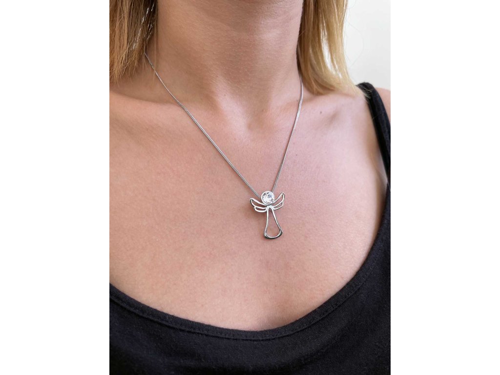 Na řetízku je zavěšen přívěsek ve tvaru anděla se zářivým Swarovski krystalem bílé barvy.