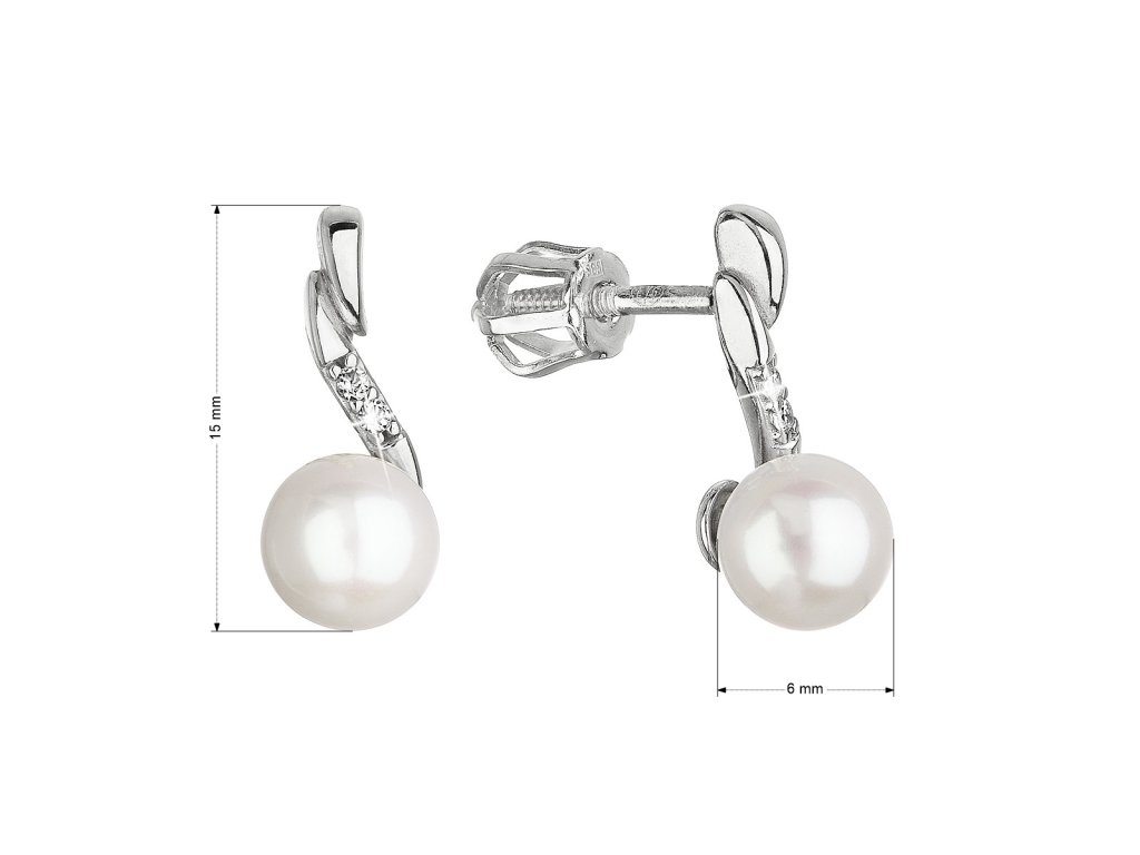 Náušnice 81PZ00027 jsou vyrobeny ze 14karátového bílého zlata s ryzostí 585/1000 lehce přizdobené zirkony s krásnou kulatou říční perlou té nejvyšší kvality AAA. Šířka perličky je 6-6,5 mm. Náušnice mají zapínání na šroubek.