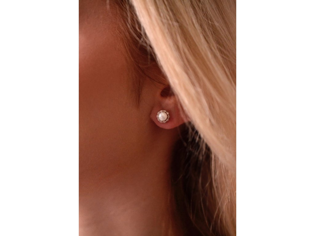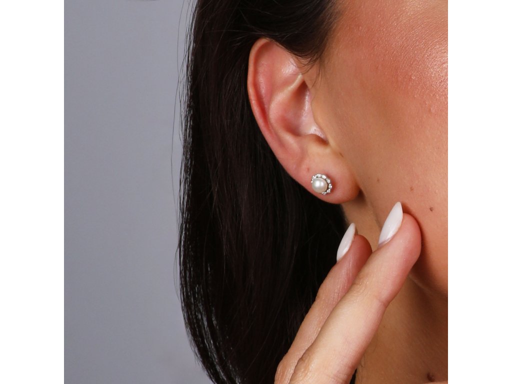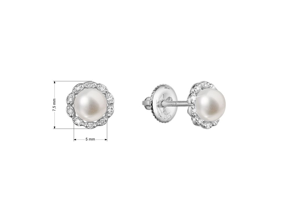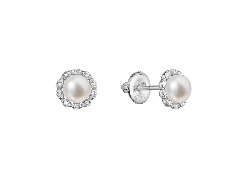 Náušnice ve tvaru kytičky z bílého zlata jsou zářivým a romantickým šperkem, který spojuje krásu bílého zlata s leskem briliantů a přírodní elegancí bílé říční perly.Na náušnice 81PB00041 bylo použito 14 karátové bílé zlato s ryzostí 585/1000 a pravé kultivované sladkovodní říční perly. Perly o průměru 5 mm se mohou pochlubit nejvyšší kvalitou AAA a tvoří střed ktětinky. Okvětní lístečky jsou z malých
