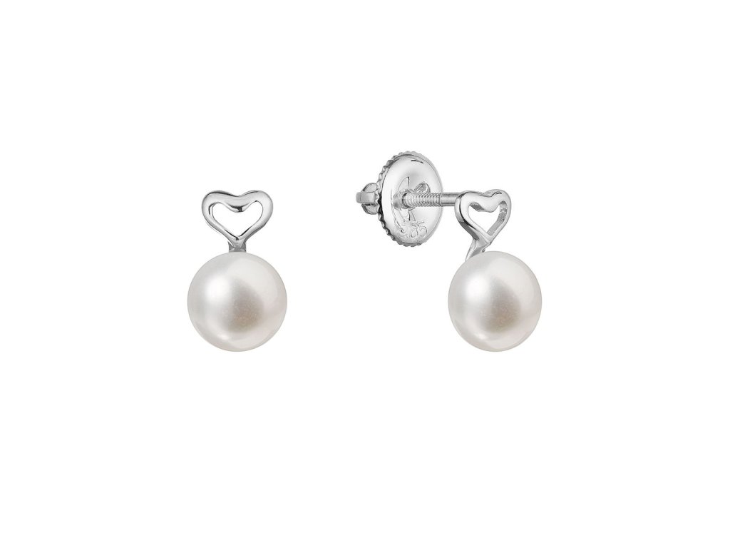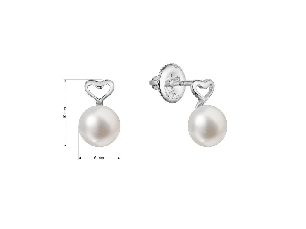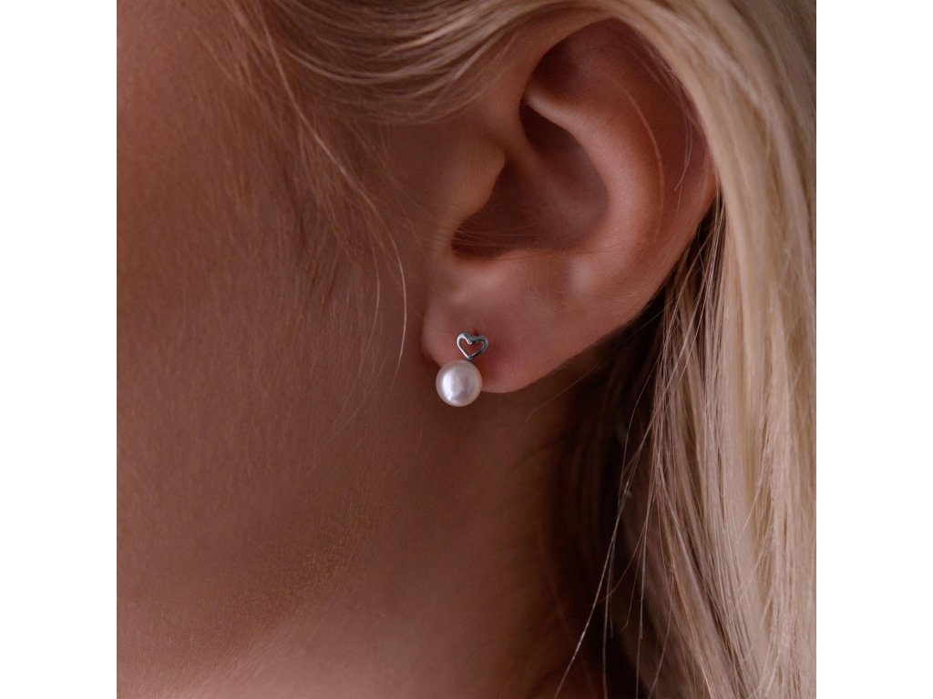 Minimalistické náušnice zlatá srdíčka jsou zvýrazněná bílou říční perličkou.Na náušnice 81P00048 bylo použito 14 karátové bílé zlato s ryzostí 585/1000 a pravé kultivované sladkovodní říční perly. Perly o velikosti 6 mm se mohou pochlubit nejvyšší kvalitou AAA.