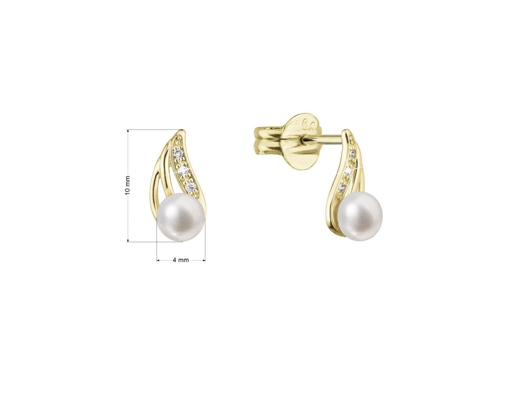 Na náušnice 91PB00056 bylo použito 14 karátové žluté zlato s ryzostí 585/1000 a pravé kultivované sladkovodní říční perly spolu s brilianty. Perly o průměru 4 mm se mohou pochlubit nejvyšší kvalitou AAA. Briliantů je celkem 6 ks o 0,030 ct..