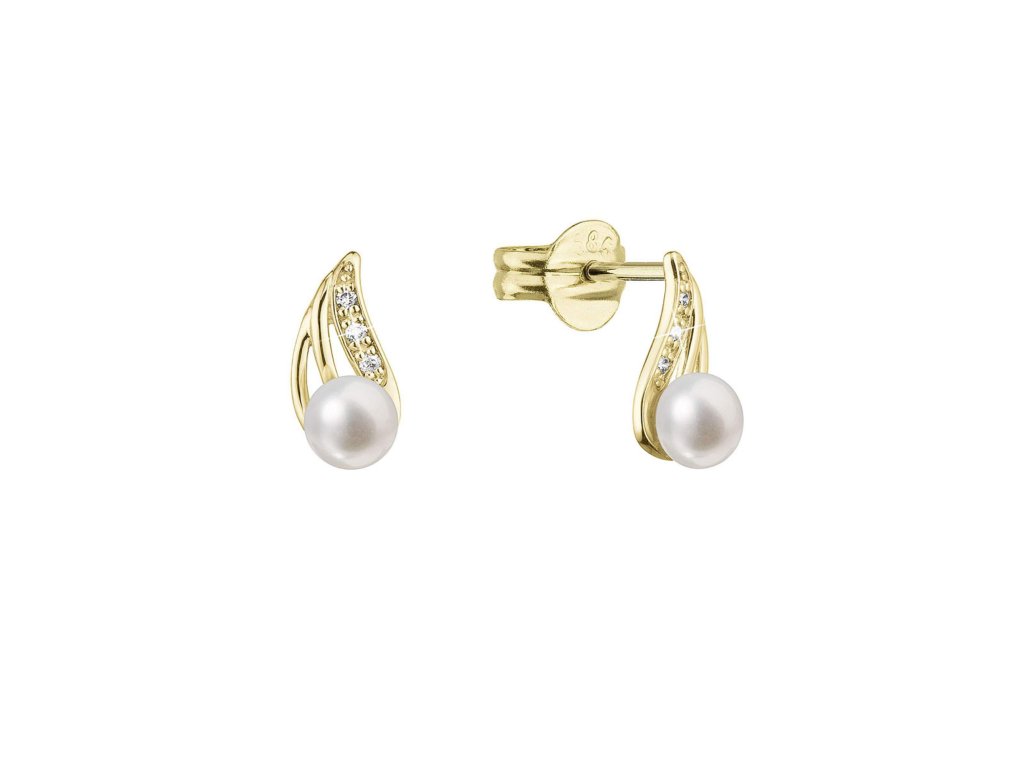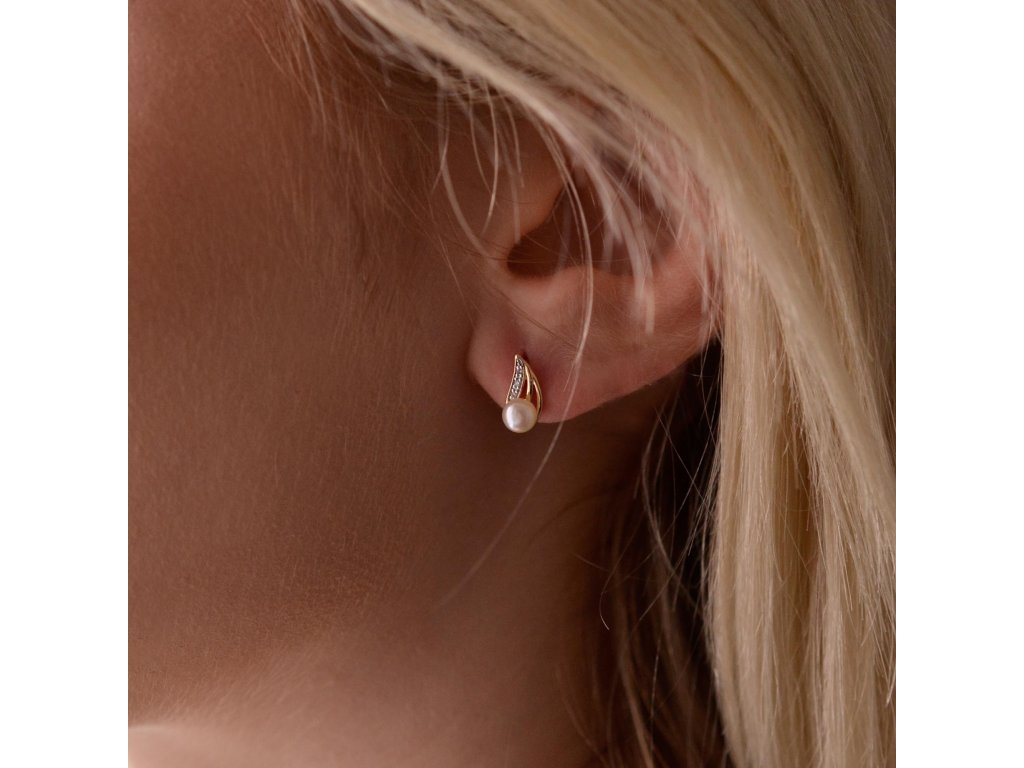 Zlaté 14 karátové náušnice s říční perlou a brilianty 91PB00056