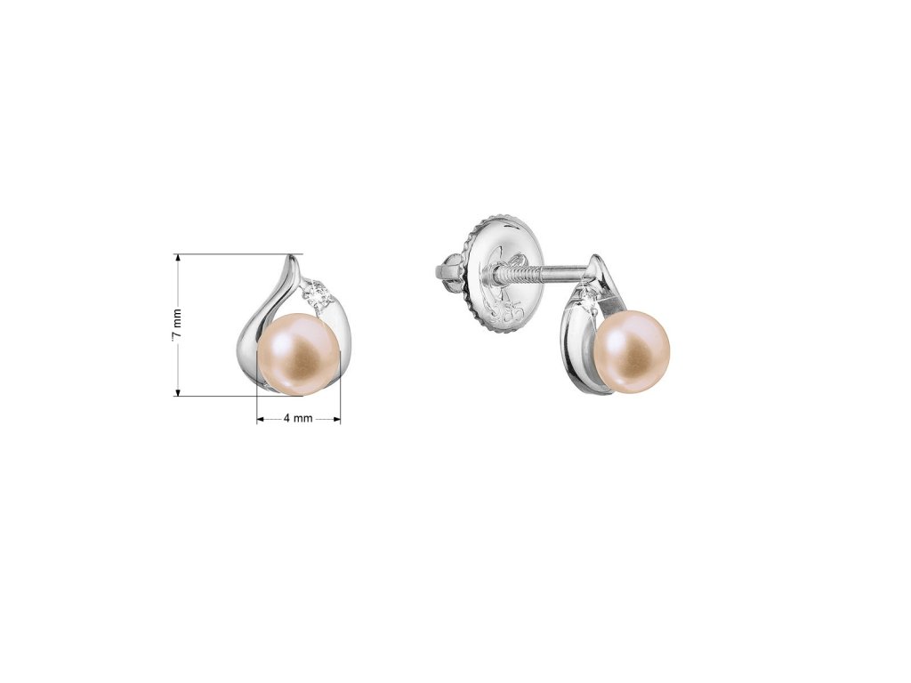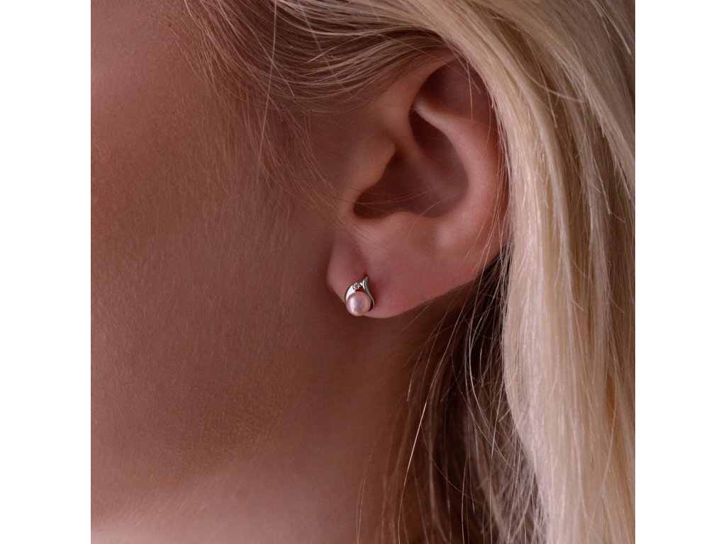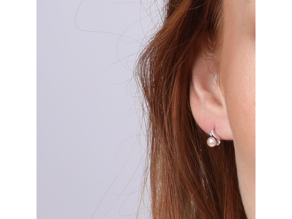 Na náušnice 81PB00052 bylo použito 14 karátové bílé zlato s ryzostí 585/1000 a pravé kultivované sladkovodní říční perly v něžném růžovém tónu. Perly o velikosti 4 mm se mohou pochlubit nejvyšší kvalitou AAA. Nad perličkou se ve zlatě třpytí malý briliant, 2 ks briliantů mají 0,018 ct..