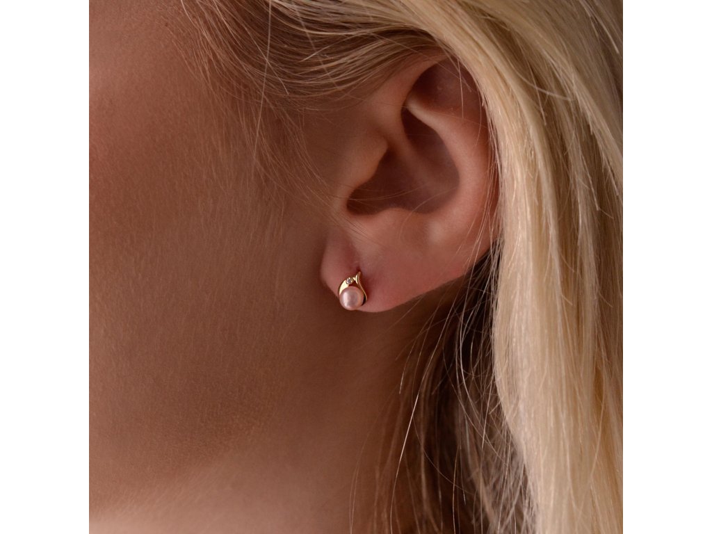Něžné zlaté náušnice ve tvaru kapičky s růžovou pravou říční perličkou a briliantem.Na náušnice 91PB00052 bylo použito 14 karátové žluté zlato s ryzostí 585/1000 a pravé kultivované sladkovodní říční perly v něžném růžovém tónu. Perly o velikosti 4 mm se mohou pochlubit nejvyšší kvalitou AAA. Nad perličkou se ve zlatě třpytí malý briliant, 2 ks briliantů mají 0,018 ct..