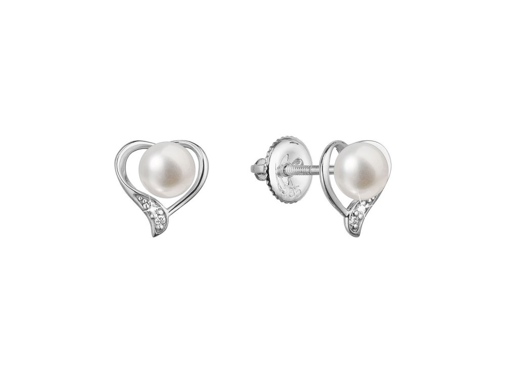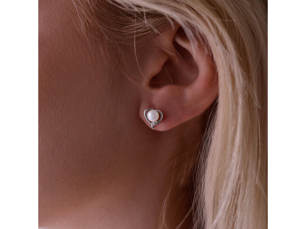 Něžné náušnice s bílou říční perlou posazenou do zlatého srdíčka s brilianty jsou nádherným šperkem z lásky.Na náušnice 81PB00054 bylo použito 14 karátové bílé zlato s ryzostí 585/1000 a pravé kultivované sladkovodní říční perly s brilianty. Perly o velikosti 5 mm se mohou pochlubit nejvyšší kvalitou AAA. Tvar zlatého srdíčka je zdobený nestárnoucími brilianty. Celkem 4 brilianty o 0,020 ct..