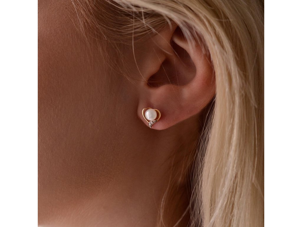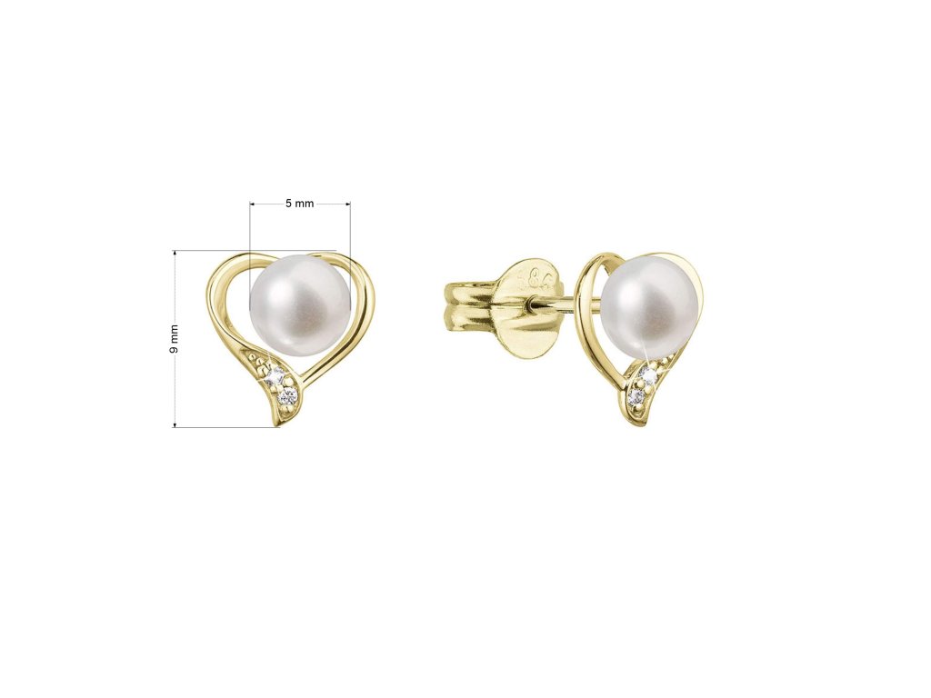 Na náušnice 91PB00054 bylo použito 14 karátové žluté zlato s ryzostí 585/1000 a pravé kultivované sladkovodní říční perly s brilianty. Perly o průměru 5 mm se mohou pochlubit nejvyšší kvalitou AAA. Tvar zlatého srdíčka je zdobený nestárnoucími brilianty. Celkem 4 brilianty o 0,020 ct..