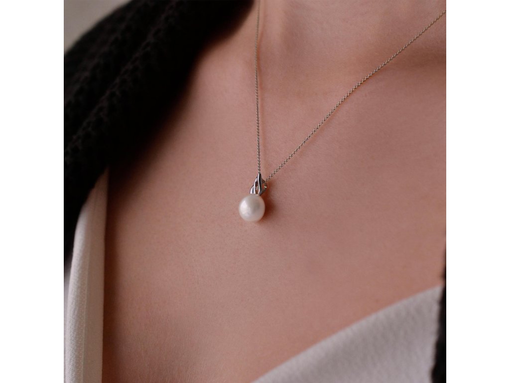 Perlička vložená na lístečku se třpytivými kapkami rosy z briliantů, tak krásný je tento náhrdelník.Na náhrdelník 82PB00038 bylo použito 14 karátové bílé zlato s ryzostí 585/1000 a pravá kultivovaná sladkovodní říční perla spolu s brilianty. Perla o průměru 9 mm je vysoké kvality AAA. A brilianty jsou celkem 2 ks 0,018 ct..