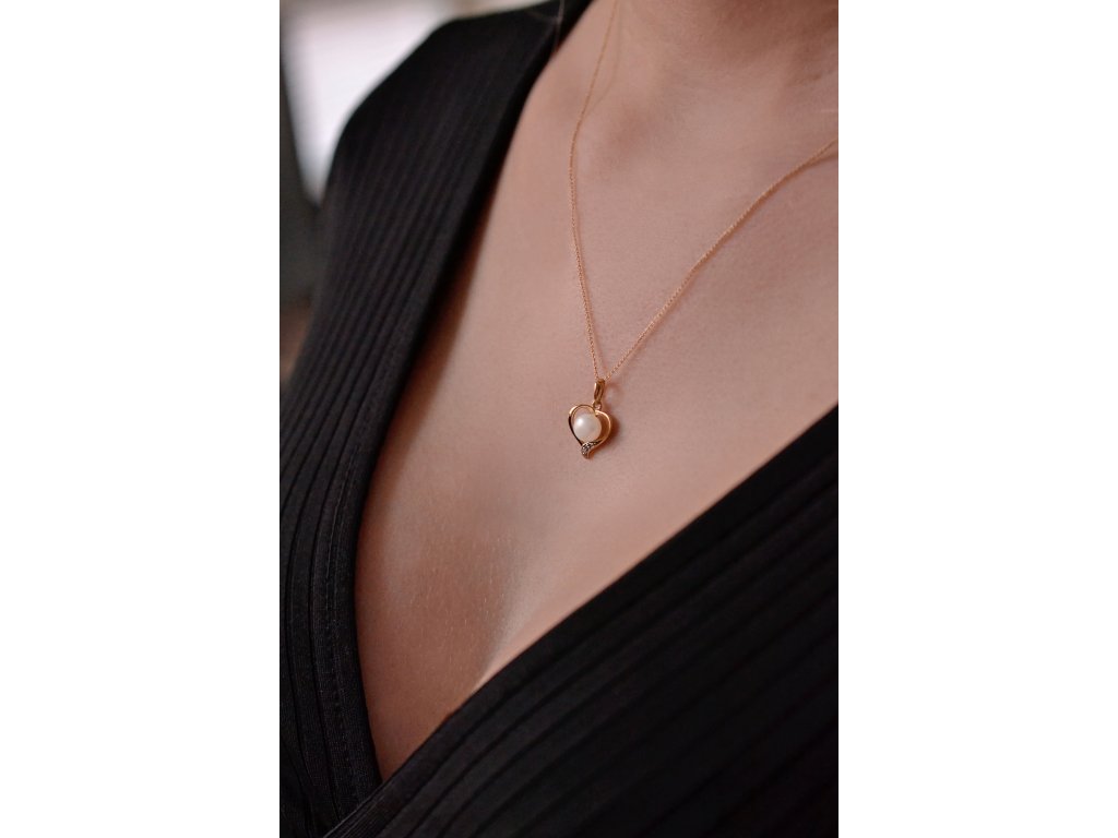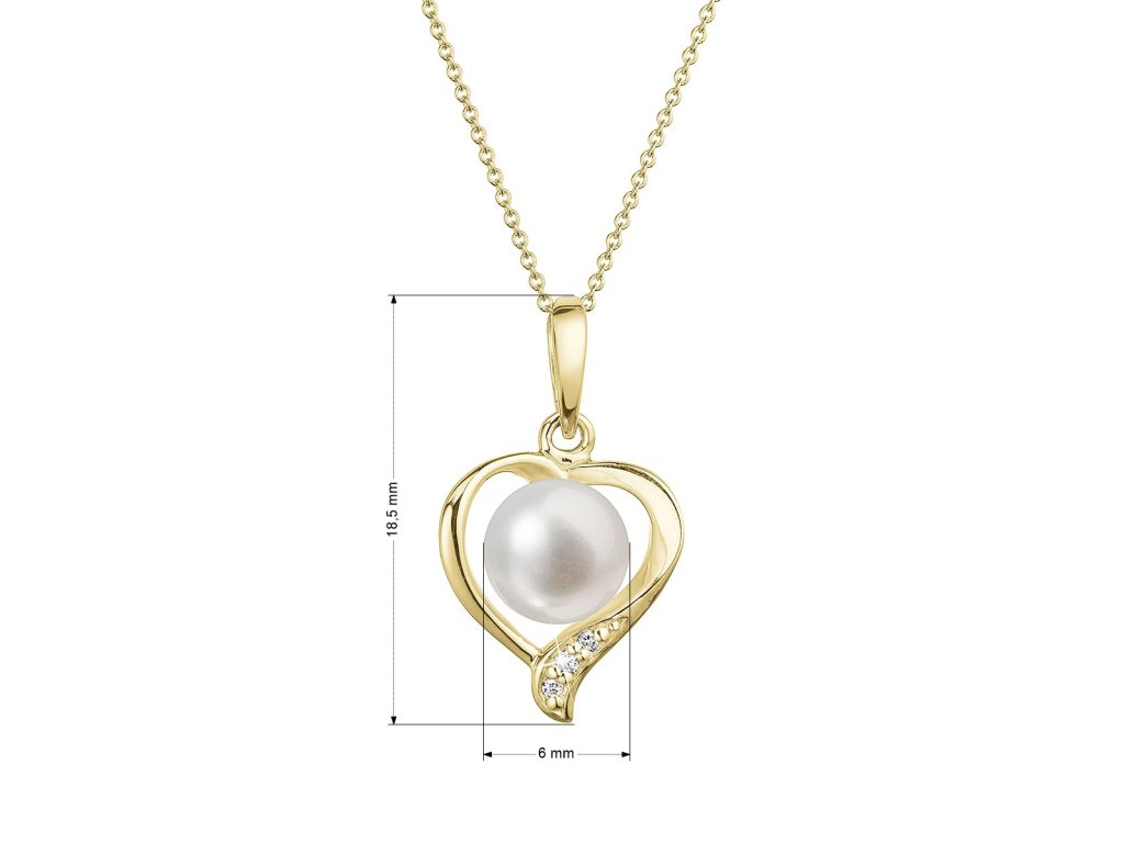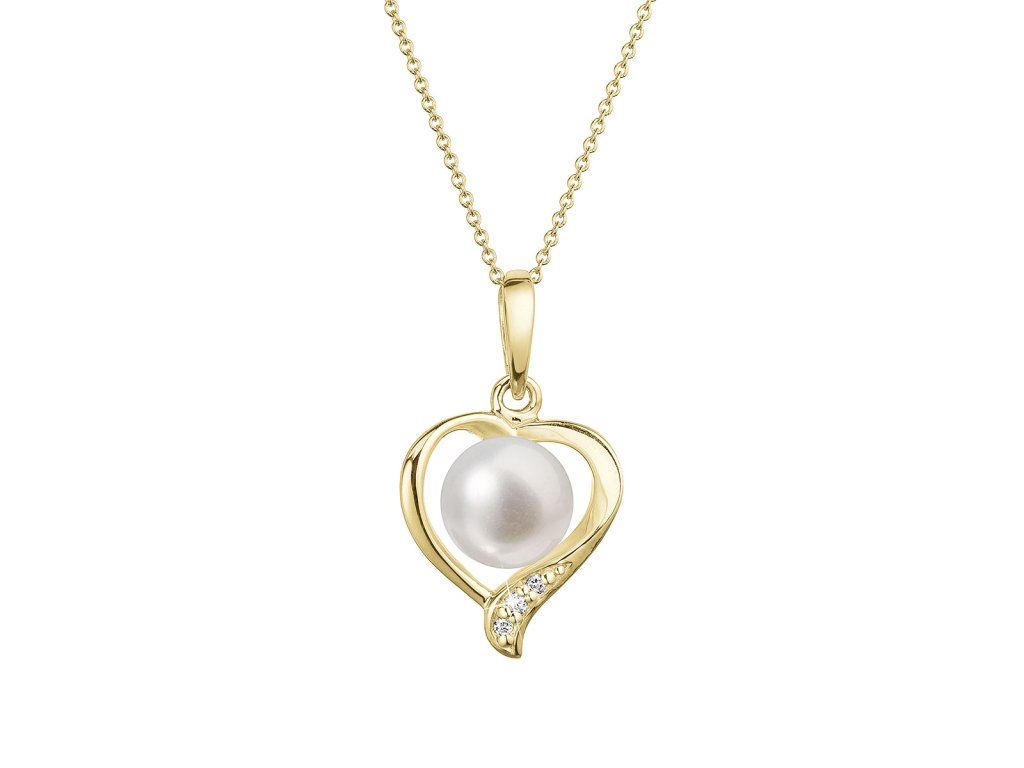 Něžný náhrdelník s bílou říční perlou posazenou do zlatého srdíčka s brilianty je nádherným šperkem z lásky.Na náhrdelník 92PB00049 bylo použito 14 karátové žluté zlato s ryzostí 585/1000 a pravá kultivovaná sladkovodní říční perla s brilianty. Perla o průměru 6 mm je vysoké kvality AAA. Tvar zlatého srdíčka je zdobený třemi nestárnoucími brilianty o 0,015 ct..